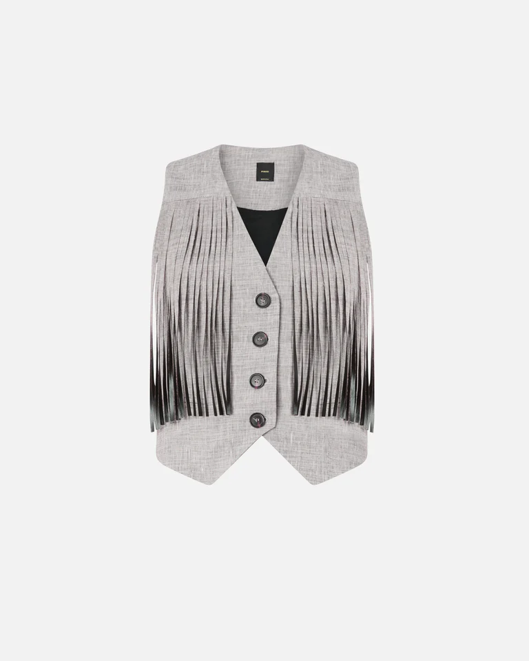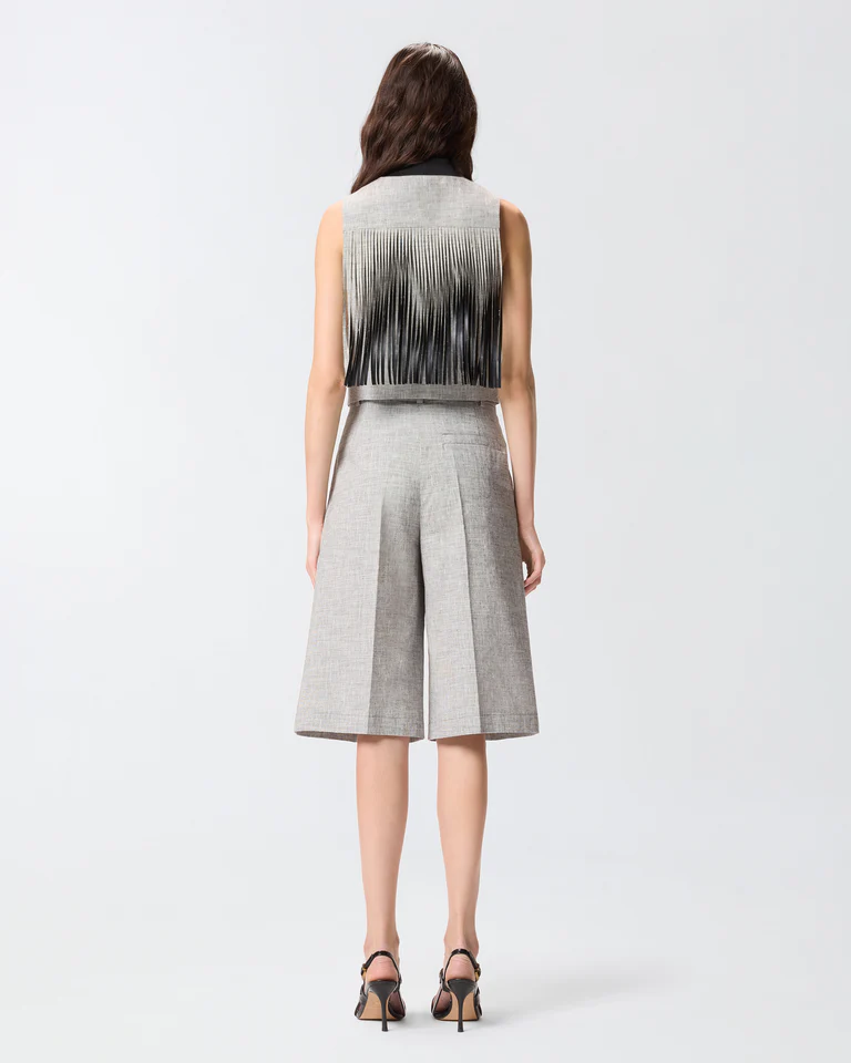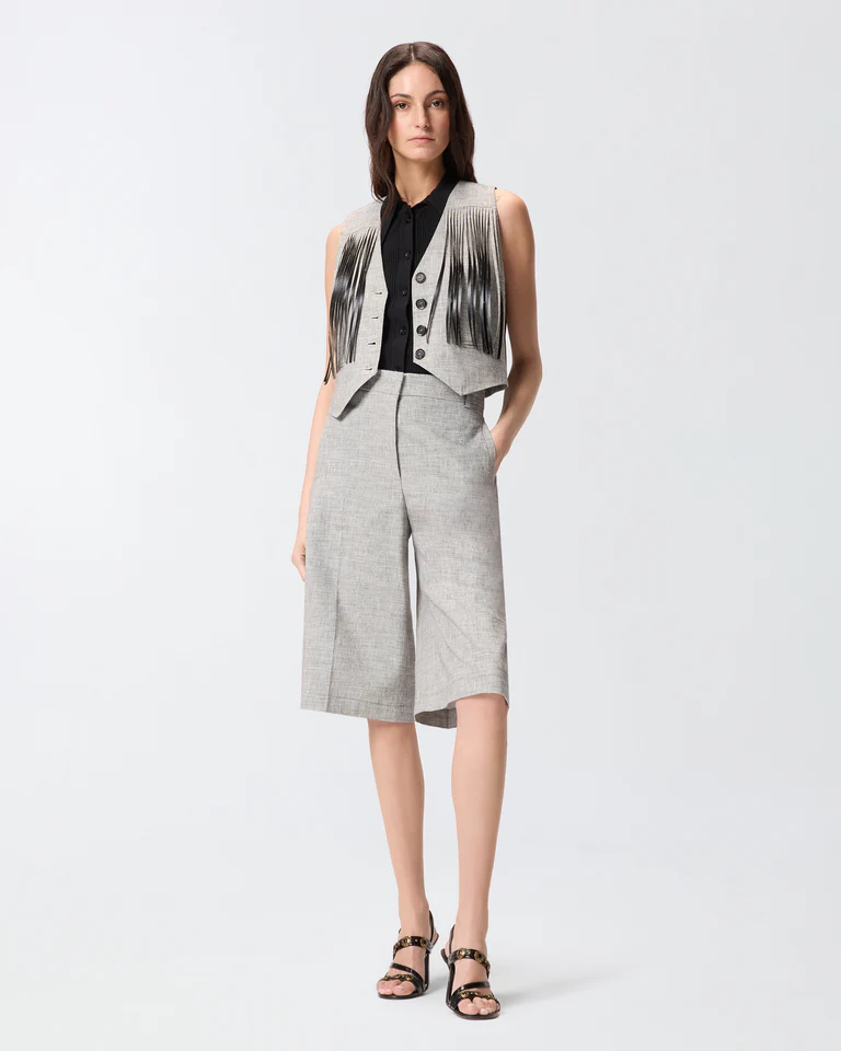 Chaleco con botonadura delantera confeccionado en una ligera mezcla de algodón y lino flameada fil-à-fil teñida en hilo. Este modelo, que cuenta con refinados bolsillos de ribete en la parte delantera, presenta un cuello de pico que contrasta con el bajo en punta. El acabado irregular y moteado del tejido crea un efecto óptico bicolor, mientras que los largos flecos en la parte delantera y trasera confieren a la prenda un estilo actual de inspiración texana.
