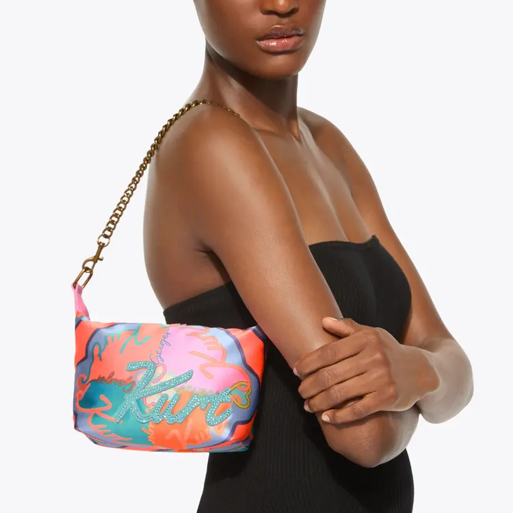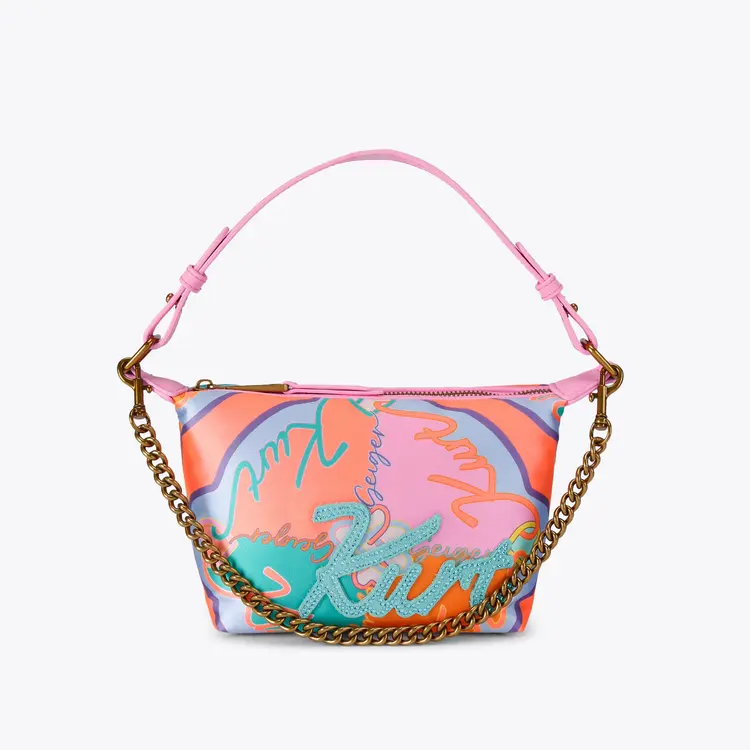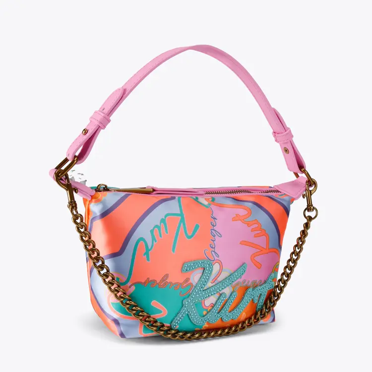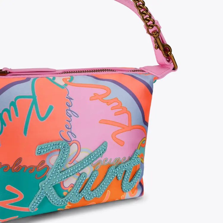Este bolso de hombro Kurt Soft está confeccionado en tela de nailon estampada con Kurt Geiger en tonos rosa y naranja. Incluye una correa de hombro de cuero rosa y otra de cadena de latón envejecido.